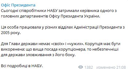 В Офисе президента подтвердили, что сегодня сотрудники НАБУ задержали руководителя одного из главных департаментов ОП. Об этом говорится в Telegram-канале Офиса президента.