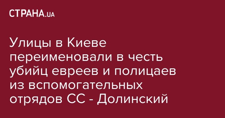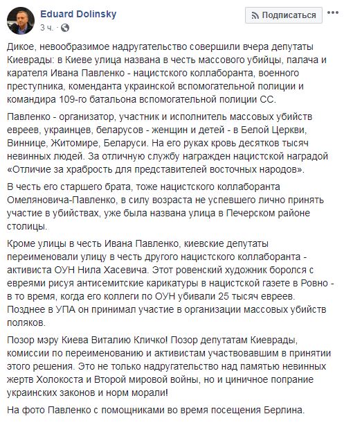 Глава Украинского еврейского комитета Эдуард Долинский возмущен решением депутатов Киеврады назвать одну из улиц украинской столицы именем коменданта украинской вспомогательной полиции и командира 109-го батальона вспомогательной полиции СС Ивана Павленко. Об этом Долинский сообщил в Facebook.
