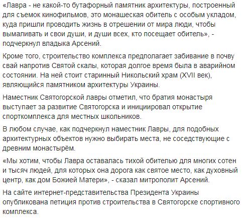 По словам владыки, под новый проект были переданы 17 га земли, в том числе заливные луга с внесенными в Красную книгу Украины травами и роща реликтовых 500-600-летних дубов. Эти земли входят в состав Национального природного парка "Святые горы" и могут быть отведены под строительство только после соответствующего решения Кабинета министров Украины.