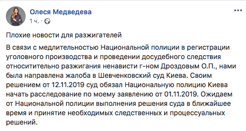 "Плохие новости для разжигателей. В связи с медлительностью Национальной полиции в регистрации уголовного производства и проведении досудебного следствия относитительно разжигания ненависти г-ном Дроздовым О.П., нами была направлена жалоба в Шевченковский суд Киева. Своим решением от 12.11.2019 суд обязал Национальную полицию Киева начать расследование по моему заявлению от 01.11.2019. Ожидаем от Национальной полиции выполнения решения суда в ближайшее время и принятие необходимых следственных и процессуальных решений", - написала Медведева.