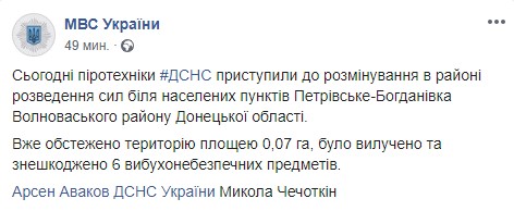 "Сегодня пиротехники ГосЧС приступили к разминированию в районе разведения сил у населенных пунктов Петровское-Богдановка Волновахского района Донецкой области", - сказано в нем.