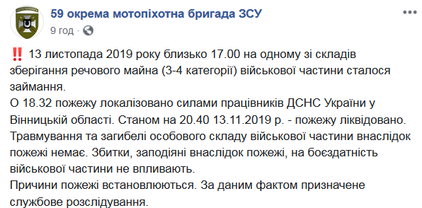 Вчера, 13 ноября, в Винницкой области, на военном складе вещевого имущества 59-й отдельной мотопехотной бригады ВСУ вспыхнул пожар, который тушили почти четыре часа. Слава Богу, что пострадавших от огня нет, как сообщил пресс-центр 59-й ОМПБр в официальном Facebook.