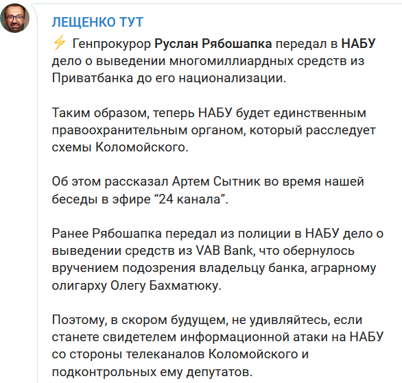 Генеральный прокурор Украины Руслан Рябошапка передал в НАБУ дело о выведении из Приватбанка средств до его национализации. Об этом передает Telegram-канале "Лещенко тут" в четверг, 14 ноября со ссылкой на главу НАБУ Артема Сытника.