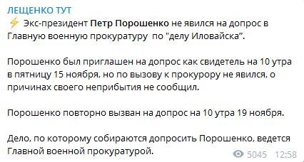 Экс-президент Петр Порошенко не пришел на допрос в Главную военную прокуратуру по "делу Иловайска". Об этом сообщает экс-нардеп Сергей Лещенко в Telegram-канале.