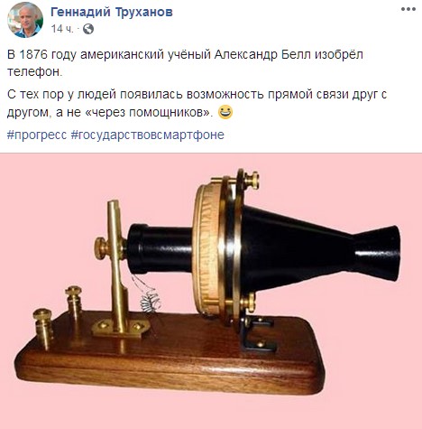 В ответ на это Труханов разместил пост о том, что человечество давно изобрело телефон. "В 1876 году американский учёный Александр Белл изобрёл телефон. С тех пор у людей появилась возможность прямой связи друг с другом, а не "через помощников", - говорится в сообщении.