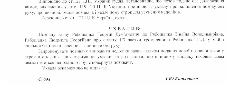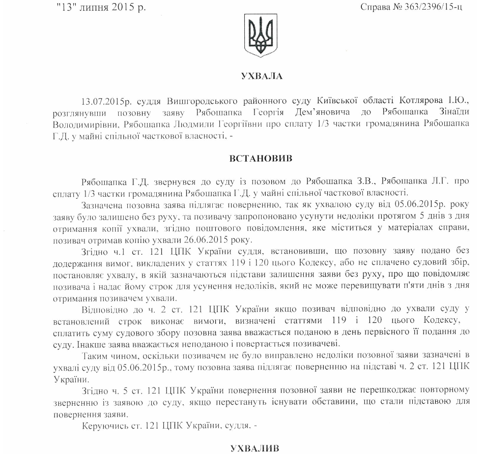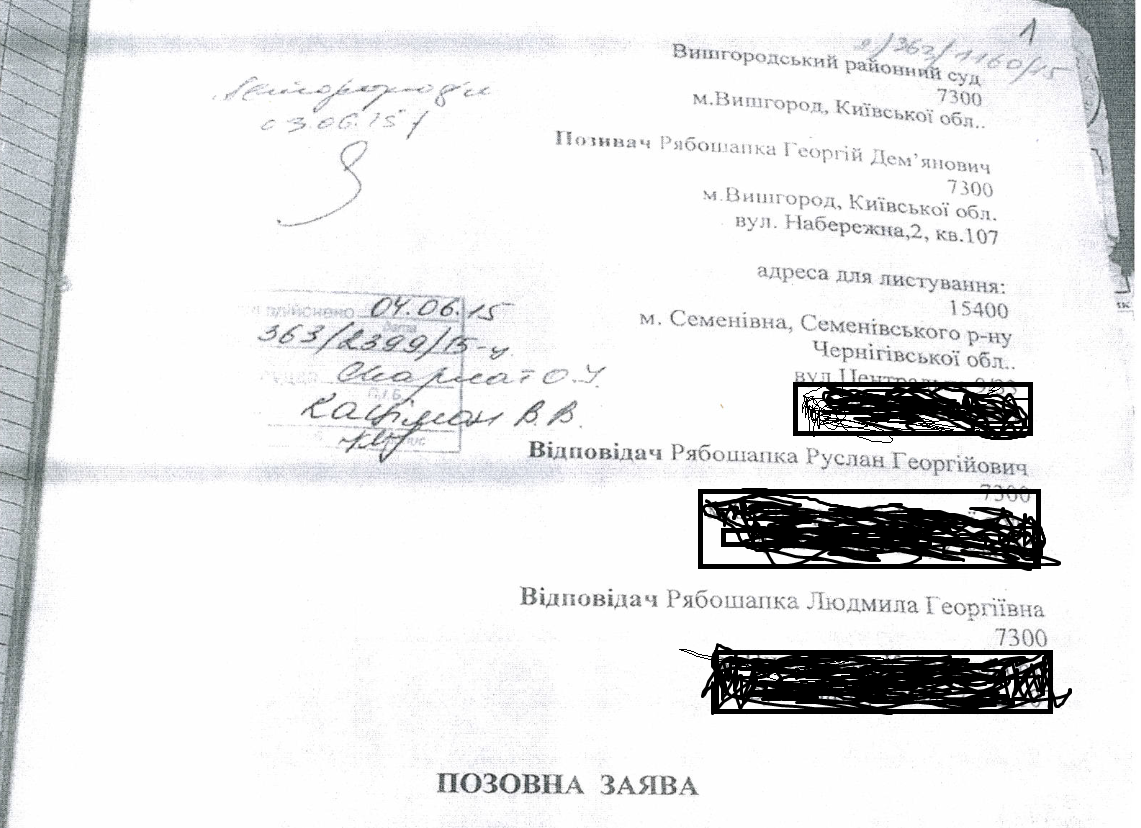 Также Рябошапка-старший в другом иске в тот же Вышгородский суд требовал от жены - Зинаиды и дочери Людмилы выплатить ему 1/3 стоимости части его квартиры в Вышгороде на улице Набережной.