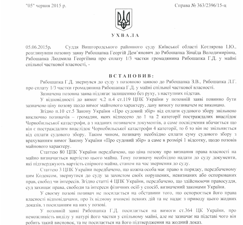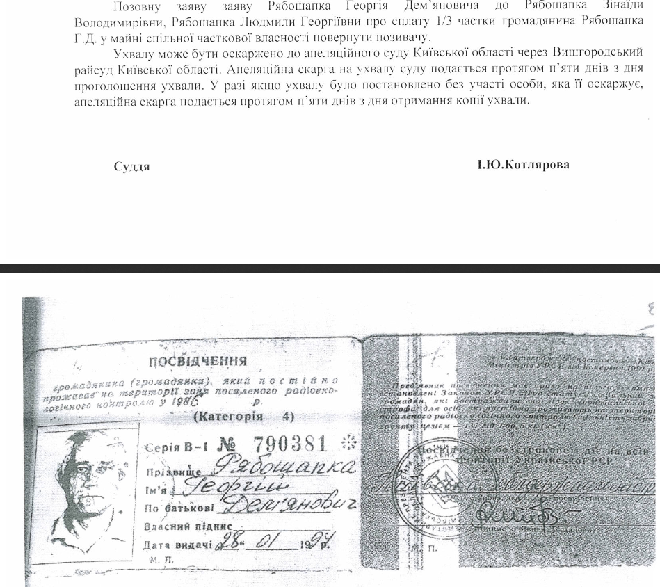 Однако суд отказал в открытии производства по формальным причинам - так как Рябошапка-старший не оплатил судебный сбор, мотивируя это наличием удостоверения чернобыльца 4-й категории.