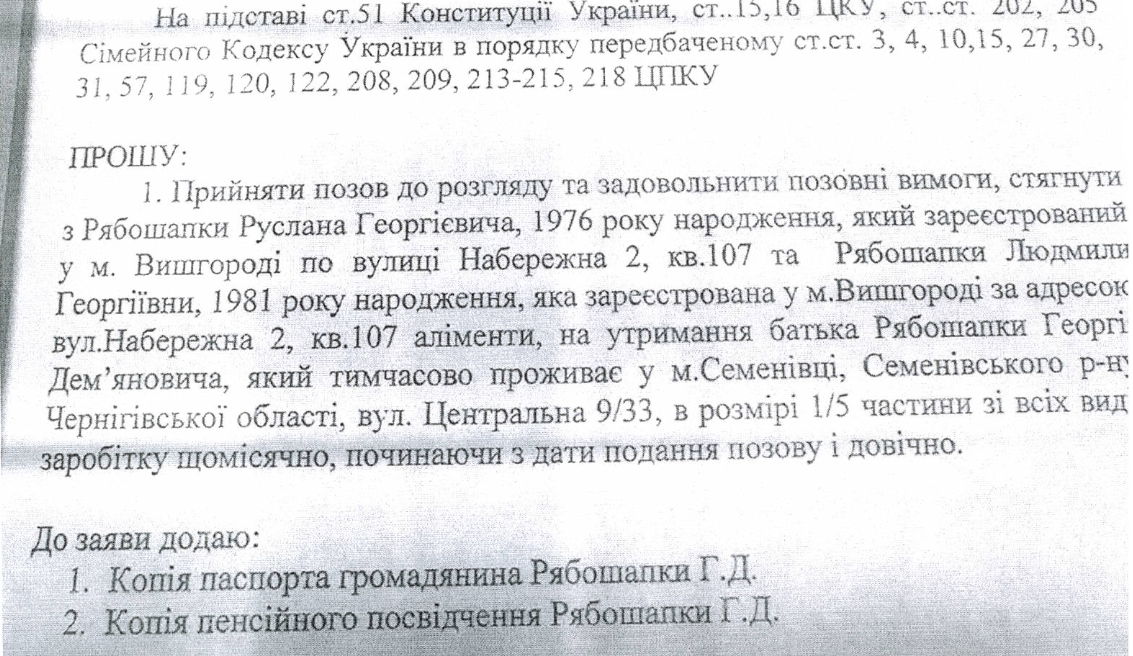 Согласно этим документам, свой первый иск к сыну - нынешнему генпрокурору и дочери - Георгий Рябошапка подал еще 4 июня 2015 года. В исковом заявлении он писал, что его единственным доходом является пенсия - 2 551 грн. 56 копеек. Что лучшие годы своей жизни он посвятил детям и их матери, но которые с 2011 года отношения с ним не поддерживают, на телефонные звонки не отвечают и выставили его на улицу из квартиры в Вышгороде на улице Набережной, которую он получил на семью в 1993 году, работая на заводе "Карат".