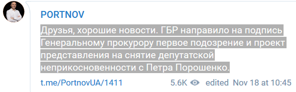"Юрист Андрей Портнов заявил, что ГБР направило на подпись Генеральному прокурору первое подозрение и проект представления на снятие депутатской неприкосновенности с Петра Порошенко.