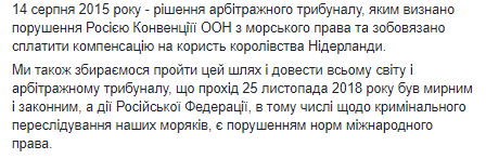"1 апреля 2019 года, в соответствии с требованиями Международной Конвенции ООН по морскому праву, мы сообщили Российской Федерации о споре по Конвенции ООН по морскому праву. Потому что захват и удерживание украинских военно-морских кораблей и членов их экипажей являются грубым нарушением Россией иммунитетов военных кораблей, гарантированных нормами международного обычного и морского права. Международный трибунал по морскому праву 25 мая 2019 года на запрос Украины обязал Россию немедленно вернуть под контроль Украины "Бердянськ", "Нікополь" и "Яни Капу" и 24 членов их экипажей. Однако приказ Международного трибунала не был и не является самоцелью. Наша цель - установление нарушения права, восстановление его и получение надлежащей компенсации", - отметила Зеркаль.