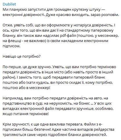По словам Дубилета, файлы с электронными подписями более безопасные, поскольку часть случаев рейдерства случаются именно через поддельные бланки доверенностей. Он также заявил, что для внедрения этой технологии уже все готово.