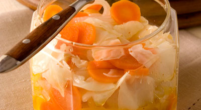 Для полезной закуски, которую можно заготовить на длительное хранение в холодильнике, нужно нарезать крупными кусками 3 кг капусты, 1 кг моркови режим грубо кружочками, добавляем 1 кг репчатого лука, нарезанного кольцами, 0,5 кг сладкого перца (соломкой). Все это перемешиваем и помещаем в большую посуду. Отдельно делаем смесь: 400 гр растительного масла, 1 ст. л. соли, полстакана сахара, половина столовой ложки 9% уксуса. Доводим ее до кипения и заливаем приготовленные овощи, варим все 10 минут, а готовый салат раскладываем в литровые банки. Храним в холодильнике.