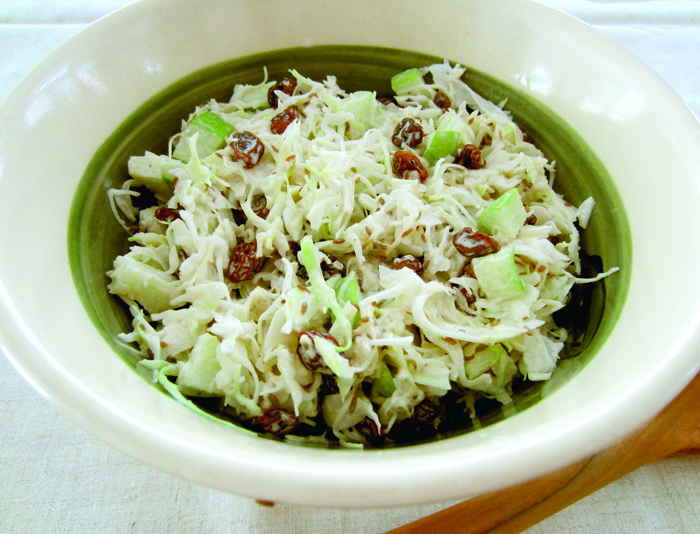 Можно приготовить салат из отварного риса и капусты. Для этого на середину салатницы выкладывают горкой рис, вокруг него - нашинкованную соломкой капусту, сверху посыпают изюмом и поливают заправкой.