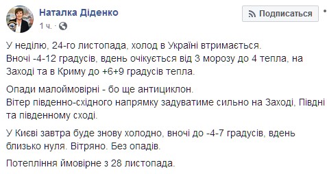 Погода в Украине 24 ноября будет холодной и ветреной. Об этом говорится в прогнозе синоптика Натальи Диденко в Facebook.