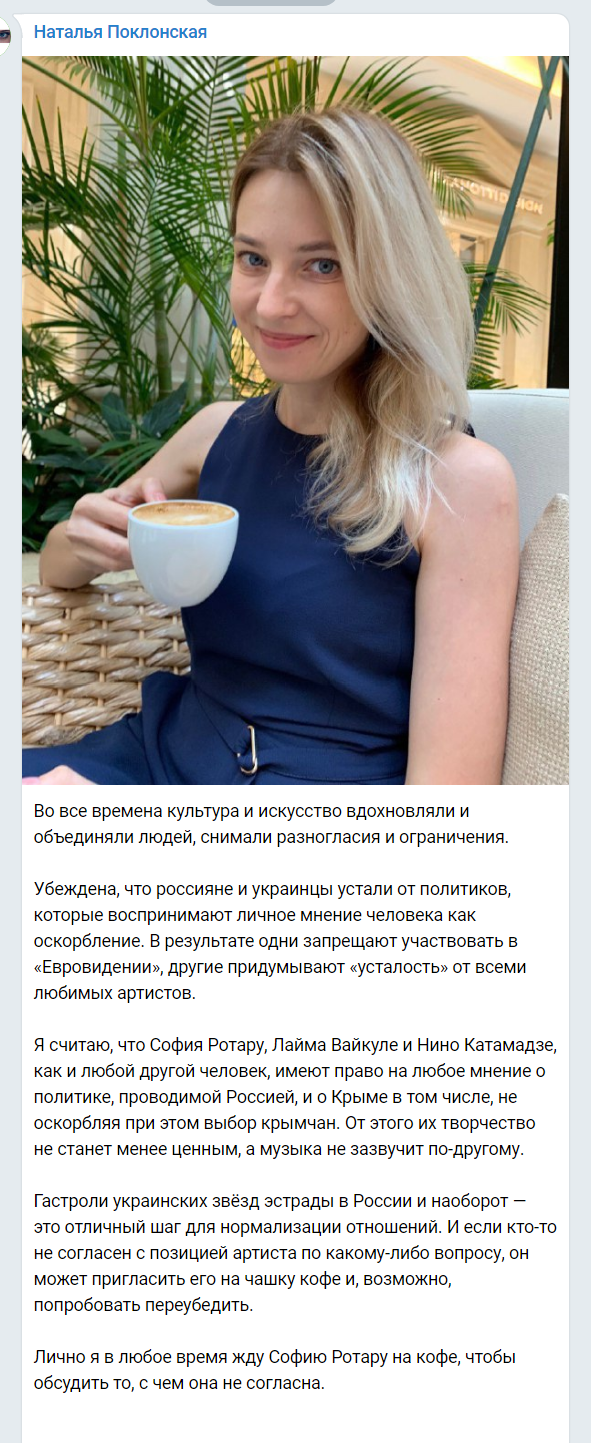 "Гастроли украинских звезд эстрады в России и наоборот - это отличный шаг для нормализации отношений. И если кто-то не согласен с позицией артиста по какому-либо вопросу, он может пригласить его на чашку кофе и, возможно, попробовать переубедить", - написала политик.
