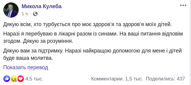 На своей странице в Facebook Николай Кулеба поблагодарил украинцев за поддержку и пообещал сообщить все детали ДТП впоследствии.