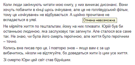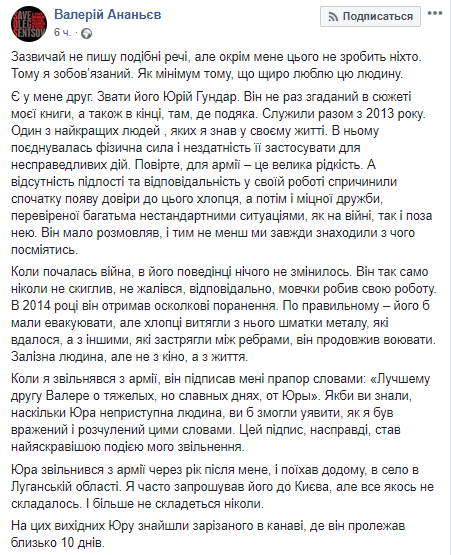 "На этих выходных Юру нашли зарезанного в канаве, где он пролежал около 10 дней… Юрий был бы последним человеком, который заслуживает так погибнуть. Но произошло все именно так. Не знаю, была ли его смерть героической, но жизнь была героической – точно", – написал он.