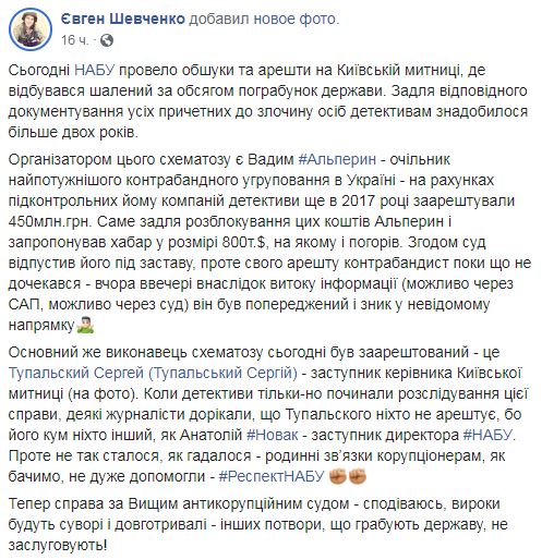 Сотрудничавший с НАБУ бизнесмен Евгений Шевченко обнародовал дополнительную информацию о том, что за обыски вчера проходили на Киевской городской таможне и связал их с делом обвиняемого в контрабанде одесского предпринимателя Вадима Альперина, за поимку которого Зеленский пообещал награду (при этом адвокат Альперина заявил, что он никда не сбегал).