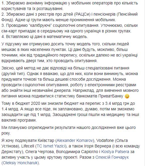 "Хочу поделиться, как мы сэкономим в следующем году 2-3 млрд грн на переписи населения. Перепись населения Украины - один из моих топ-20 проектов. Его проведение было запланировано на конец следующего года, и в бюджете на него было предусмотрено 3,4 млрд грн. Почти 100.000 интервьюеров с планшетами должны были обойти дома и квартиры украинцев", - говорит министр.