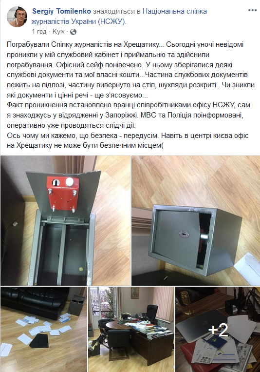 "Ограбили Союз журналистов на Крещатике... Сегодня ночью неизвестные проникли в мой служебный кабинет и приемную и совершили ограбление. Офисные сейфы повреждены. В них хранились некоторые служебные документы и мои собственные средства... Часть служебных документов лежит на полу, часть вывернута на стол, ящики раскрыты. Исчезли документы и ценные вещи - еще выясняем...