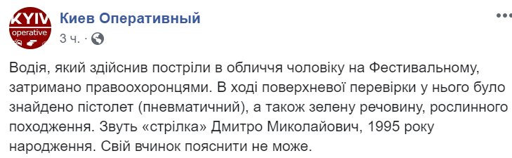 "Около 23:00 пострадавший переходил дорогу по пешеходному переходу возле ТЦ "Фестивальный". Так как водитель автомобиля Hyundai не уступил дорогу мужчине - у них начался конфликт. Сначала словесный, а затем водитель достал пистолет и сделал несколько выстрелов", – говорится в сообщении на сайте Киев Оперативный.