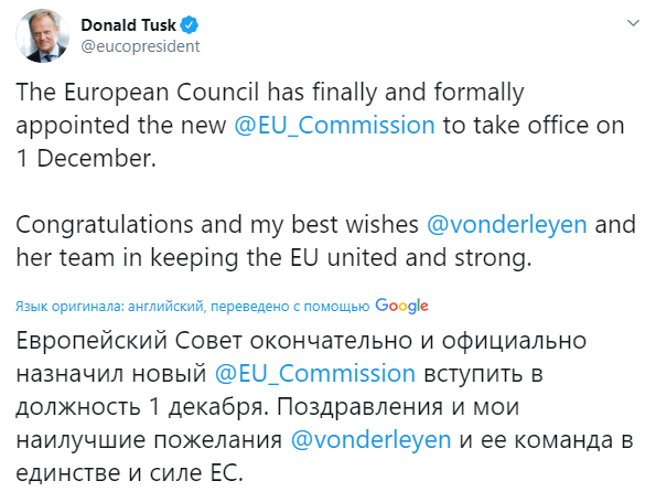 "Поздравления и мои наилучшие пожелания фон дер Ляйен и ее команде по поддержанию единства и силы ЕС", - написал Туск на своей странице в Тwitter.