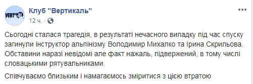 В Словакии 28 ноября погибли двое украинских альпинистов - инструктор Владимир Михалко и альпинистка Ирина Скрилева.