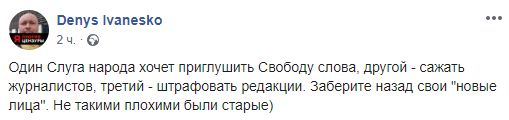 Денис Иванеско пишет о других поползновениях правящей партии ограничить журналистов: "Один Слуга народа хочет приглушить Свободу слова, другой - сажать журналистов, третий - штрафовать редакции. Заберите назад свои "новые лица". Не такими плохими были старые".