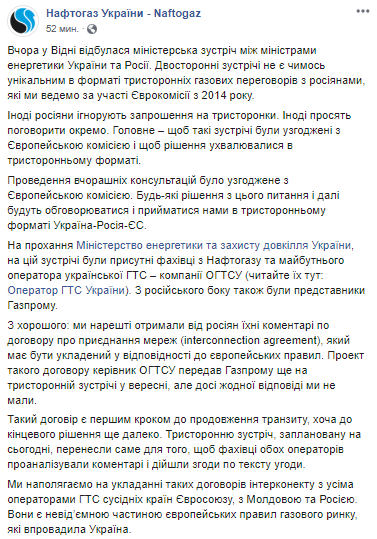 "Из хорошего: мы, наконец, получили от россиян их комментарии по договору о присоединении сетей (interconnection agreement), который должен быть заключен в соответствии с европейскими правилами. Проект такого договора руководитель ОГТСУ передал "Газпрому" еще на трехсторонней встрече в сентябре, но до сих пор мы не имели никакого ответа", - говорится в сообщении.