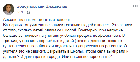 "Абсолютно некомпетентный человек. Во-первых, от учителя не зависит сколько людей в классе. Это зависит от того, сколько детей рядом со школой. Во-вторых, при нагрузке больше 30 человек на учителя учебный процесс неэффективен. В-третьих, у нас есть переизбыток детей (точнее, дефицит школ) в густонаселенных районах и недостача в депрессивных регионах. От учителя это не зависит. Закрывать в школы, чтобы села вымирали и дальше? И даже целые города. Или насильно переселять?", - написал он.