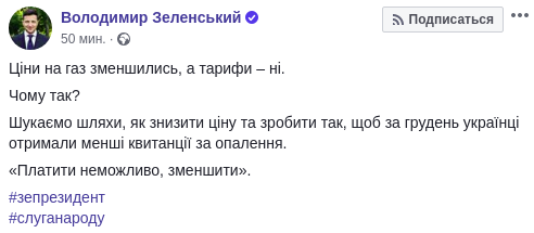 "Цены на газ уменьшились, а тарифы - нет. Почему так? Ищем пути, как снизить цену и сделать так, чтобы за декабрь украинцы получили меньшие квитанции за отопление" - написал глава государства и приложил к посту видео с совещания.