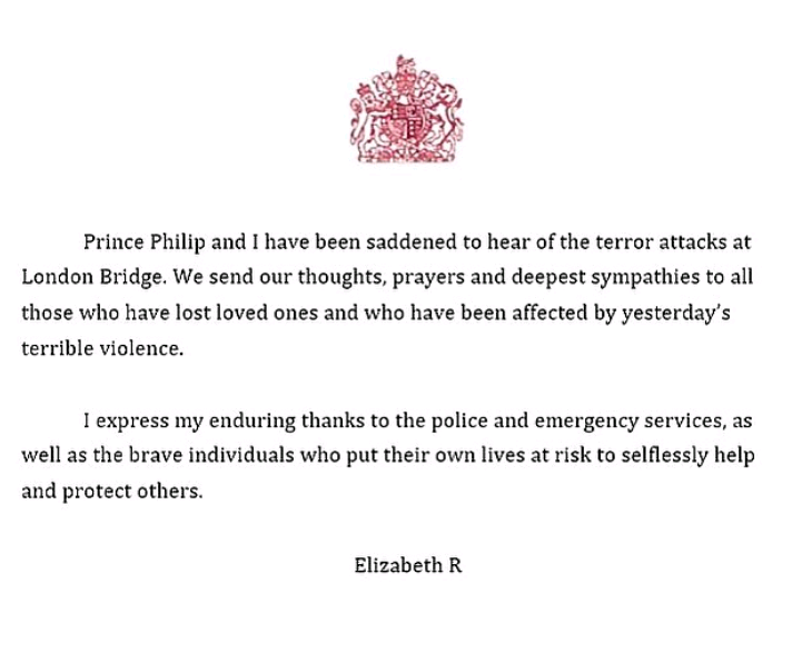 "Принц Филипп и я были опечалены, узнав о терактах на Лондонском мосту. Мы посылаем наши мысли, молитвы и глубочайшие соболезнования всем тем, кто потерял близких и пострадал от вчерашнего ужасного насилия. Я выражаю свою постоянную благодарность полиции и службам экстренной помощи, а также смелым людям, которые подвергли свою жизнь риску, самоотверженно помогая и защищая других", - сказано в сообщении королевы.
