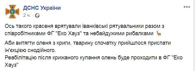 В Иванковском районе Киевской области сотрудники Государственной службы Украины по чрезвычайным ситуациям (ГСЧС) спасли оленя, который не мог выбраться из полыньи. Об этом сообщается в Facebook Госслужбы.