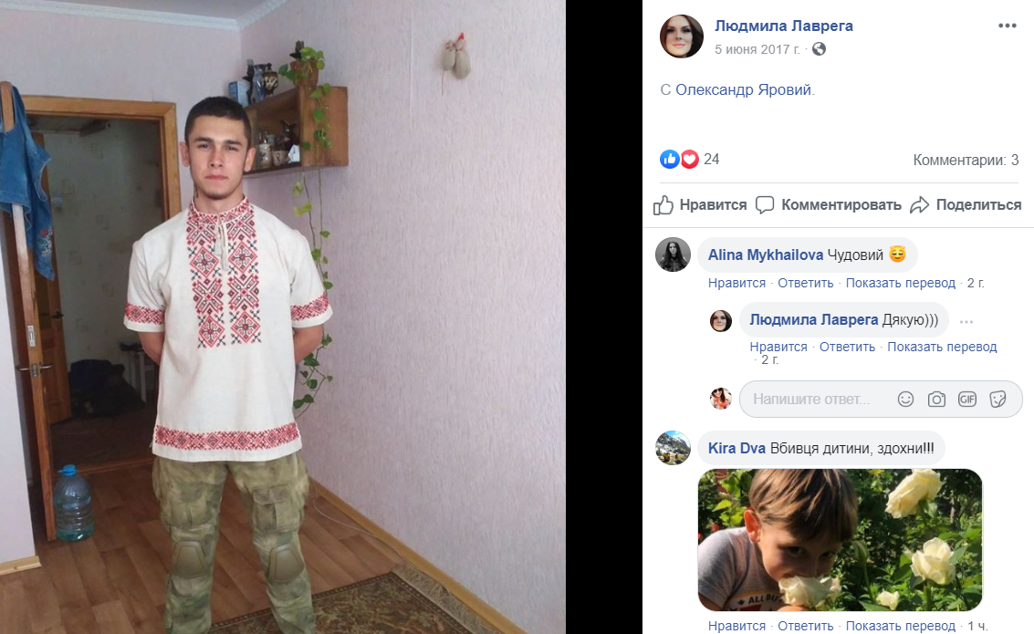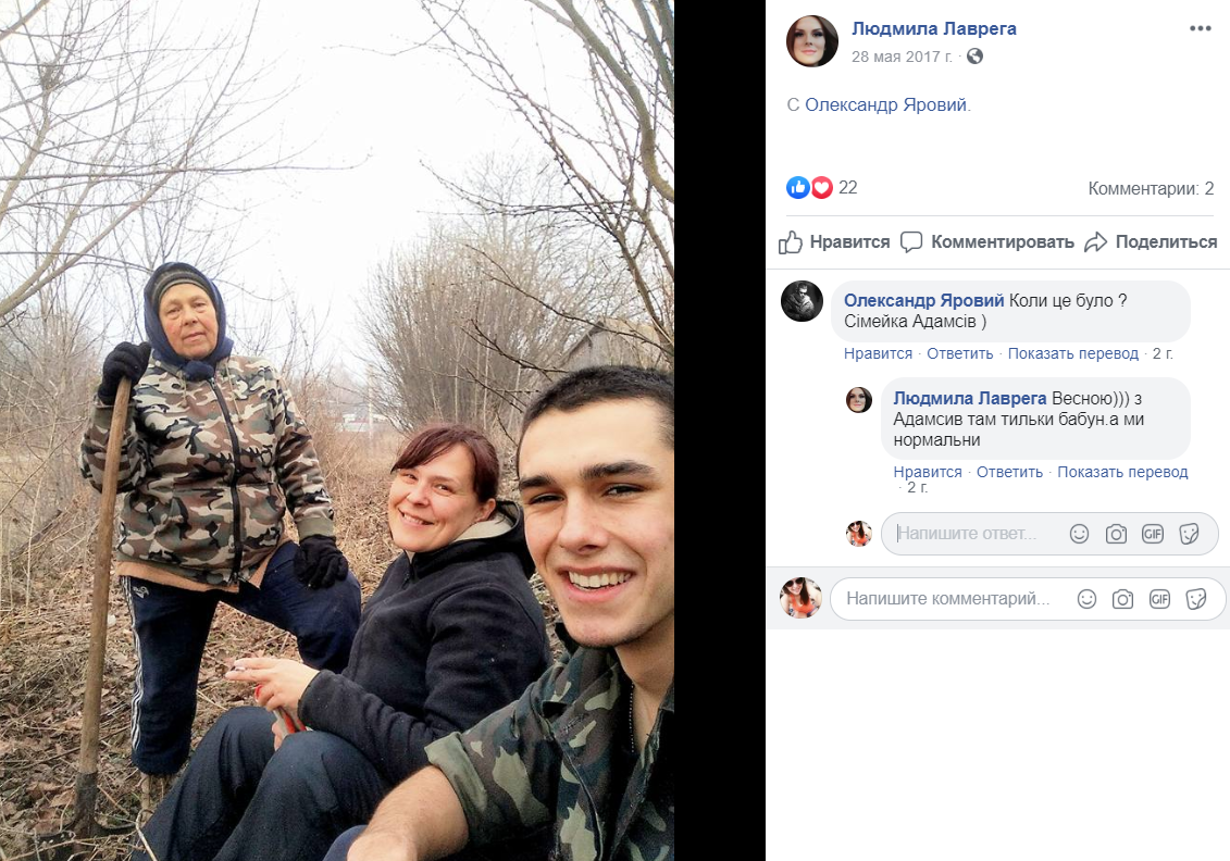 Людмила - местная волонтерша АТО. На ее Facebook много фотографий с "Яровым" в обнимку. По всей вероятности, это ее сын.