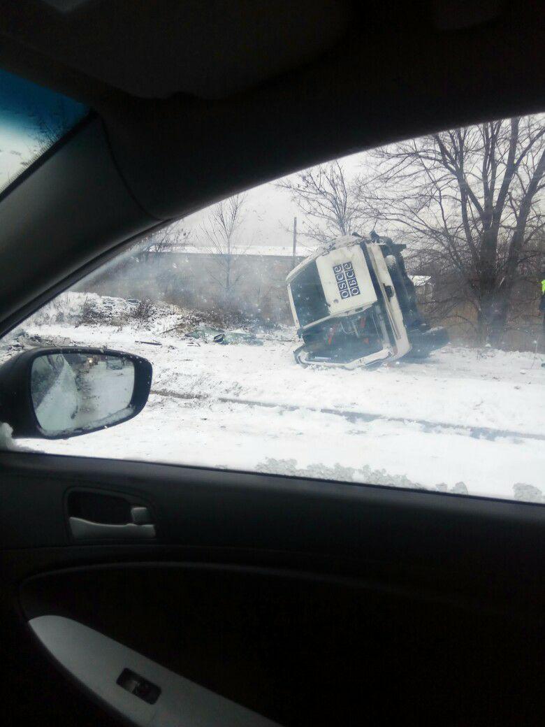 На неподконтрольном Донбассе съехал на обочину и перевернулся автомобиль миссии ОБСЕ. Фото
