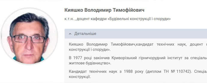 Кияшко является кандидатом технических наук, доцентом кафедры "Строительные конструкции и сооружения" Киевского института железнодорожного транспорта, преподает дисциплину "Строительные конструкции и сооружения на транспорте".