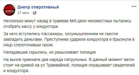 "Несколько минут назад в трамвае №9 двое неизвестных пытались отобрать кассу у кондуктора. За него вступились пассажиры, злоумышленники не смогли завладеть деньгами. Преступники ударили кондуктора и брызнули в лицо слезоточивым газом. Нападавшие скрылись, их разыскивает полиция", - говорится в сообщении.
