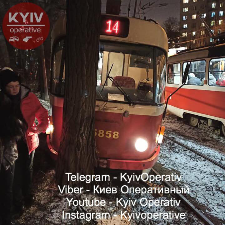 Авария случилась поздно вечером 3 декабря в районе улицы Николая Шпака. Трамвай № 14 по неизвестным причинам сошел с рельсов и влип в большое дерево.