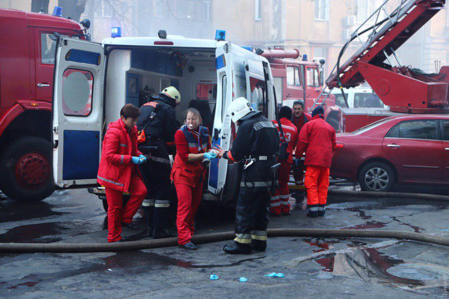 В связи с инцидентом мэрия Одессы отложила заседание исполнительного комитета, а мэр города лично прибыл посмотреть на пылающее здание. При этом в самом здании еще остаются студенты.