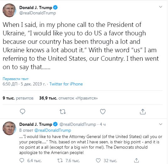 Президент США Дональд Трамп признался, что в телефонном разговоре с лидером Украины Владимиром Зеленским в июле 2019 года просил оказать услугу для Соединенных Штатов, а не для себя. Об этом глава Белого дома написал в своем аккаунте Twitter.
