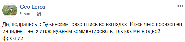 Макс Бужанский сказал "Стране", что никого не бил. Другие очевидцы говорят, что депутаты просто толкались. Но сам Лерос в Facebook подтвердил факт драки. "Да, подрались с Бужанским, разошлись во взглядах. Из-за чего произошел инцидент, не считаю нужным комментировать, так как мы в одной фракции", - заявил нардеп.