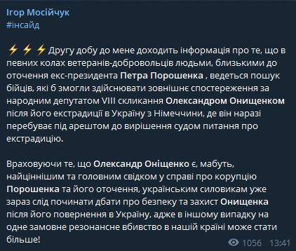 "Вторые сутки до меня доходит информация о том, что в определенных кругах ветеранов-добровольцев людьми, близкими к окружению экс-президента Петра Порошенко, ведется поиск бойцов, которые бы смогли осуществлять наружное наблюдение за народным депутатом VIII созыва Александром Онищенко после его экстрадиции в Украину из Германии, где он сейчас находится под арестом до решения судом вопроса об экстрадиции", - говорится в сообщении.