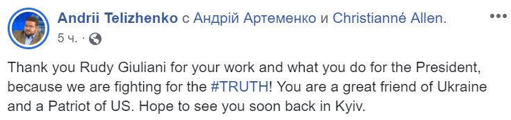 "Спасибо, Руди Джулиани, за вашу работу и за то, что вы делаете для Президента, потому что мы боремся за правду! Вы большой друг Украины и Патриот США. Надеюсь скоро увидеть вас снова в Киеве", - говорится в опубликованном сообщении в Facebook.