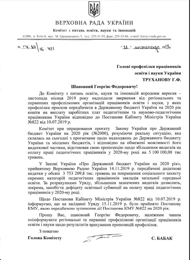 В то же время Бабак уточнил, что в бюджете Украины на 2020 год предусмотрены дополнительные расходы в объеме почти 3,6 млрд гривен на улучшение социальной защиты отдельных категорий педагогических работников учреждений общего среднего образования.