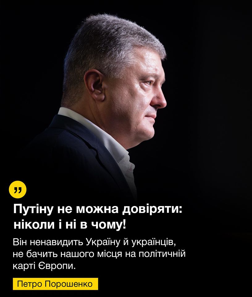 Запись Порошенко сопроводил картинкой с цитатой из себя же: "Путину нельзя доверять: никогда и ни в чем! Он ненавидит Украину и украинцев, не видит нашего места на политической карте Европы".