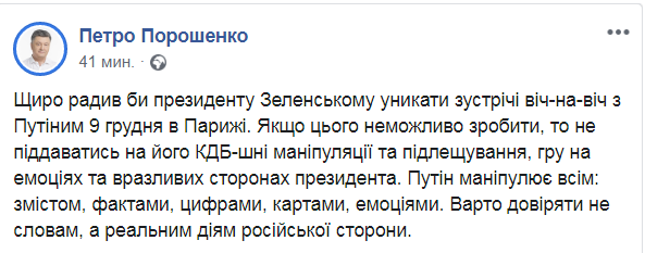 "Искренне советую президенту Зеленскому избегать встречи с глазу на глаз с Путиным 9 декабря в Париже. Если этого невозможно сделать, то не поддаваться на его КГБ-шные манипуляции и заискивания, игру на эмоциях и недостатках президента. Путин манипулирует всем: содержанием, фактами, цифрами, картами, эмоциями. Стоит доверять не словам, а реальным действиям российской стороны", - написал экс-президент и фигурант многочисленных уголовных дел.