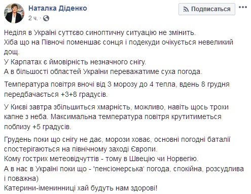 "Воскресенье в Украине существенно синоптическую ситуацию не изменит. Разве что на севере станет меньше Солнца и местами ожидается небольшой дождь. В Карпатах есть вероятность незначительного снега. А в большинстве областей Украины будет преобладать сухая погода", - сказала она.