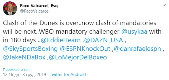 "Буря в пустыне закончилась… начинается битва обязательств…обязательный претендент от WBO Александр Усик. Встреча должна состоятся в течении 180 дней", говорится в сообщении. То есть, Усик и Джошуа должны провести бой до 4 июня 2020 года.