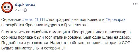 Сегодня, 8 декабря, в Броварах (Киевская область) на перекрестке улиц Грушевского и Ярослава Мудрого произошло ДТП: автомобиль столкнулся с мотоциклом. Об этом сообщается на сайте dtp.kiev.ua.