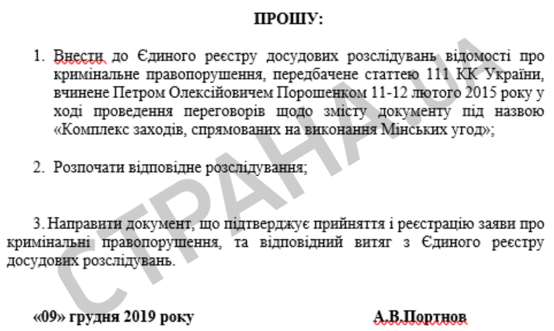Таким образом Портнов трактует согласование Порошенко Минских договоренностей как госизмену в пользу России (статья 111 УК Украины).